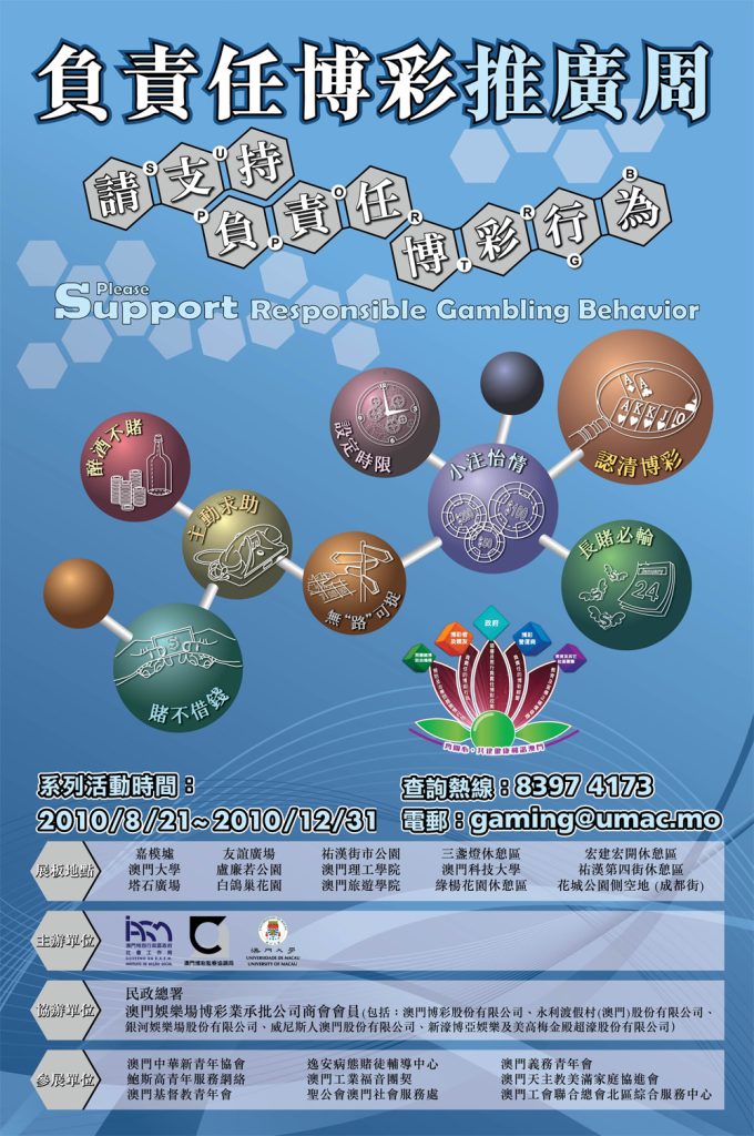 2010 行政長官崔世安先生在施政報告中提到「加大力度防治病態賭博和問題賭博,致力推動負責任博彩」。 首頁 >> 負責任博彩里程碑 << 2009 | 2011 >> 行政長官崔世安先生在施政報告中提到「加大力度防治病態賭博和問題賭博,致力推動負責任博彩」。 負責任博彩推廣2010海報: marklei Lei Man Kit2024-07-16T10:49:41+08:00